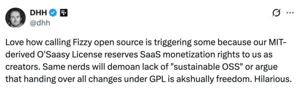 37signals/Basecamp has a great new product called Fizzy, whose brilliance and innovative qualities are being distracted from by its co-creator David Heinmeier Hansson’s insistence on calling it open source. “One more thing… Fizzy is open source and 100% free to run yourself.”